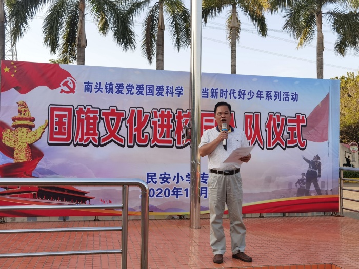 為進一步增強少年兒童的國旗意識、愛國主義精神,引領(lǐng)廣大少年兒童踐行社會主義核心價值觀,樹立愛國主義遠大理想,11月6日,“國旗文化進校園”入隊儀式活動在南頭鎮(zhèn)民安小學(xué)開展。南頭鎮(zhèn)教育和體育事務(wù)中心主任謝桂華、關(guān)工委副主任黃祺宗、退役軍人服務(wù)中心工作人員李嘉銘、心碩訓(xùn)練營導(dǎo)師張福立教官、五老人員出席了本次活動。