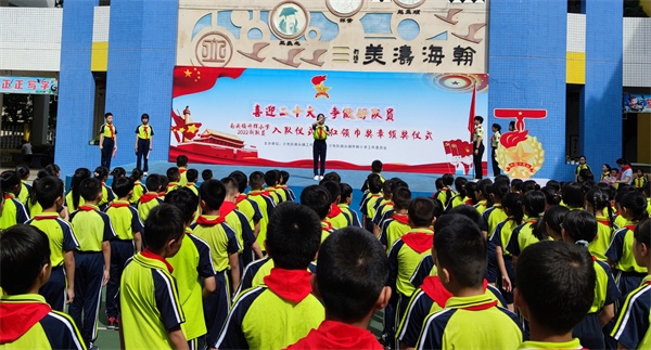 紅領(lǐng)巾獎(jiǎng)?wù)率鞘裁矗考t領(lǐng)巾獎(jiǎng)?wù)率巧傧汝?duì)組織日常開展教育活動(dòng)和評(píng)價(jià)激勵(lì)的重要載體,分為基礎(chǔ)章、特色章、星級(jí)章。在頒獎(jiǎng)儀式上,南頭鎮(zhèn)升輝小學(xué)大隊(duì)輔導(dǎo)員江婷婷老師組織全校師生學(xué)習(xí)并詳細(xì)介紹“紅領(lǐng)巾獎(jiǎng)?wù)隆钡脑O(shè)置,展示、講解每一枚基礎(chǔ)章和星級(jí)章的圖形和寓意,并且解讀了南頭鎮(zhèn)升輝小學(xué)紅領(lǐng)巾爭(zhēng)章方案。