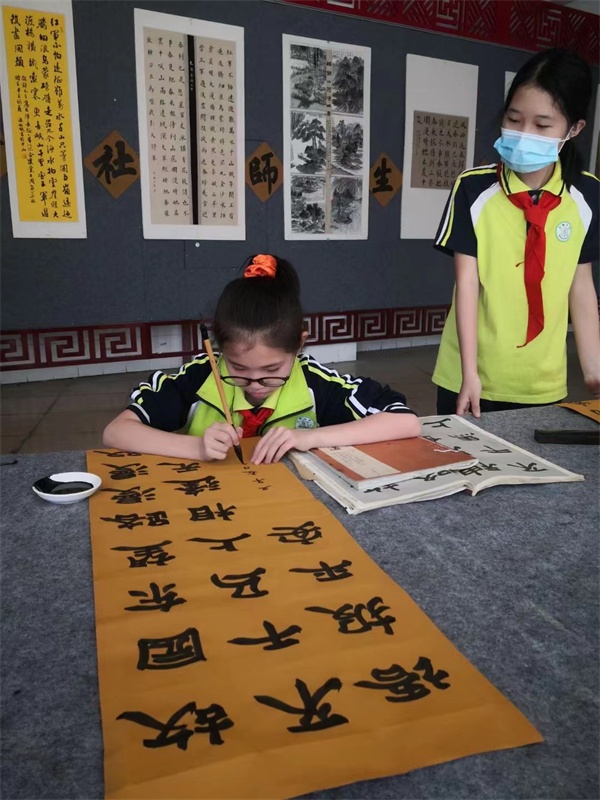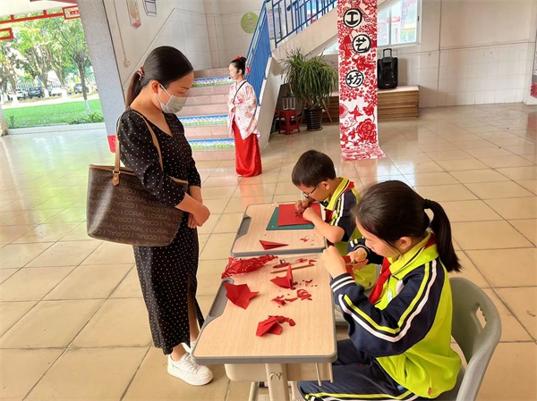 活動伊始,南頭鎮(zhèn)升輝小學(xué)民樂社團、剪紙社團、書法社團為嘉賓老師們呈現(xiàn)精彩紛呈的社團成果。民樂團演奏的《沒有共產(chǎn)黨就沒有新中國》以傳統(tǒng)樂器演繹紅色經(jīng)典歌曲,讓人耳目一新;剪紙社團成員的剪刀在一張張紅紙上翻飛,轉(zhuǎn)出副副古韻悠悠的窗花剪紙;書法社團成員在一筆一畫中詮釋中華文化。
