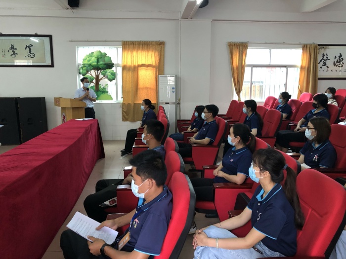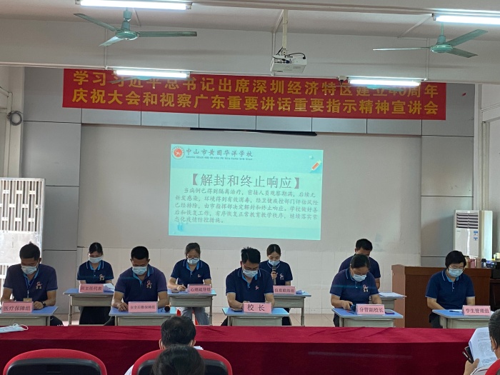 為切實(shí)有效地防范和積極應(yīng)對(duì)春季新冠肺炎疫情,進(jìn)一步提高應(yīng)急能力,及時(shí)、科學(xué)、規(guī)范、有序處置可能出現(xiàn)的新冠肺炎疫情。2022年5月10日上午,中山市黃圃華洋學(xué)校開(kāi)展了新冠肺炎疫情處置桌面推演。中山市黃圃華洋學(xué)校聶長(zhǎng)紅校長(zhǎng)、各應(yīng)急組員代表以及學(xué)校教師參與了這次演練。黃圃鎮(zhèn)教育和體育事務(wù)中心教研員姚勁強(qiáng)老師和黃圃鎮(zhèn)人民醫(yī)院副院長(zhǎng)楊靈院長(zhǎng)蒞臨學(xué)校指導(dǎo)疫情防控應(yīng)急演練活動(dòng)。