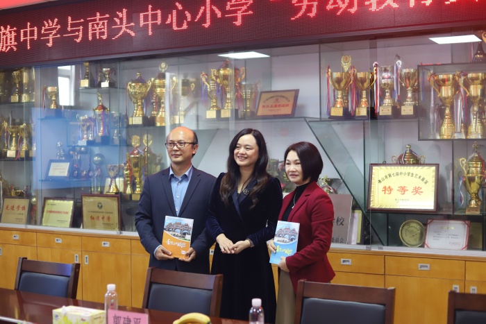 講座結(jié)束后陳亞玲校長贈送給南頭鎮(zhèn)中心小學(xué)勞動教育校本教材讀本、紅旗中學(xué)建校35周年紀念品,郭建平、吳婉韻兩位副校長代表接收,活動圓滿結(jié)束。