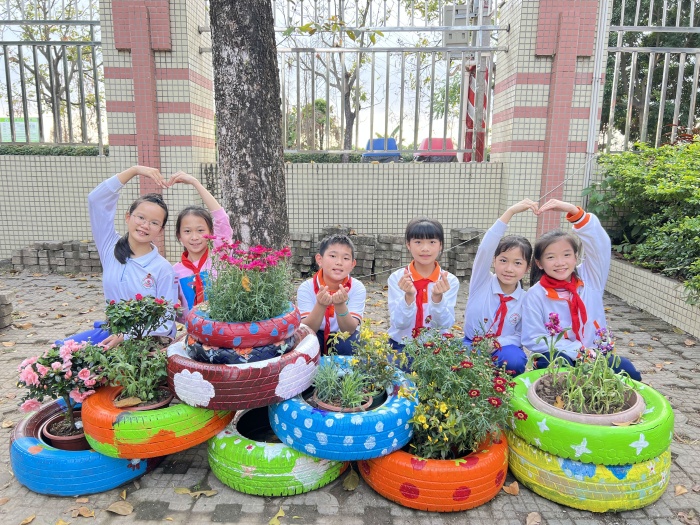 最后,同學(xué)們開(kāi)展廢舊輪胎改造活動(dòng)。同學(xué)們一起完成搬運(yùn)輪胎、繪畫(huà)、填土、除草、翻整等準(zhǔn)備工作后,親手移植花草,仔細(xì)地為它們澆水。五彩斑斕的廢舊輪胎升級(jí)成漂亮的花圃,為校園增添了一道亮麗的風(fēng)景線。