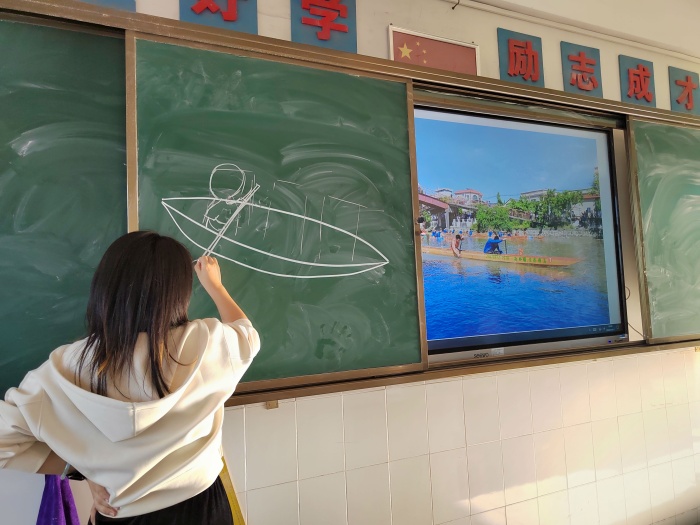 活動開始,蕭欣沂老師親切地給同學(xué)們介紹了非遺文化——三人根艇賽。通過讓同學(xué)們觀看三人根艇賽的視頻,了解三人根艇的形態(tài)、顏色及競技方式,并感受到三人根艇賽時熱鬧的場面。