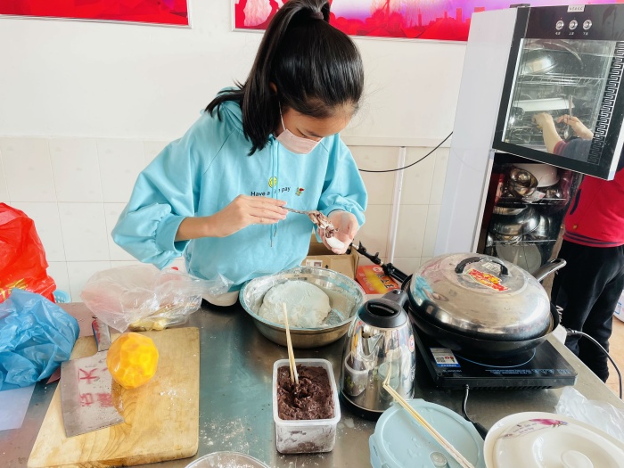 一番忙碌過后,包好的湯圓終于下鍋了?!鞍パ剑@個散開的可能是我包的?!薄澳憧?!這個胖乎乎的是我包的。”學(xué)生們紛紛指著鍋里的湯圓笑著說。還有的學(xué)生煮起了從家里帶的湯圓,吃著自己親手煮的湯圓,心里也美滋滋的。雖然做出來的湯圓大小不一,形狀各異,但大家吃著自己的湯圓,心中有種說不出的幸福。