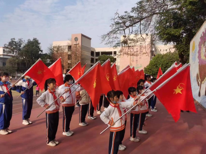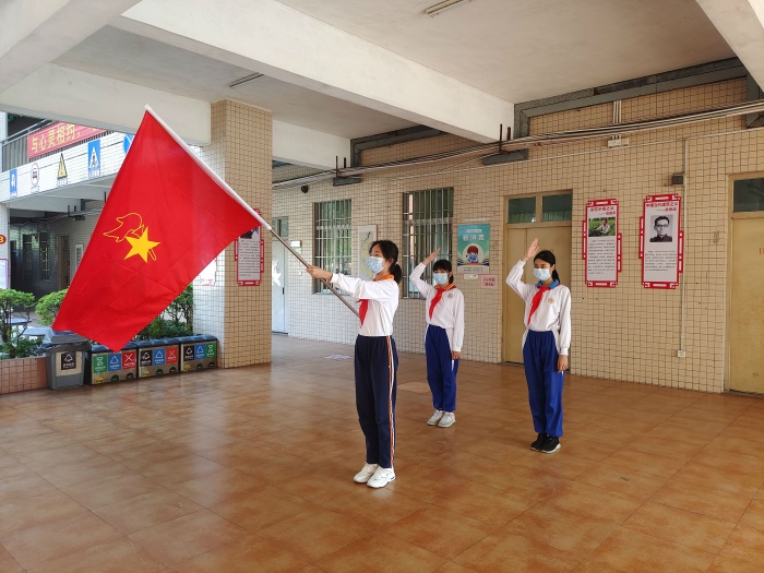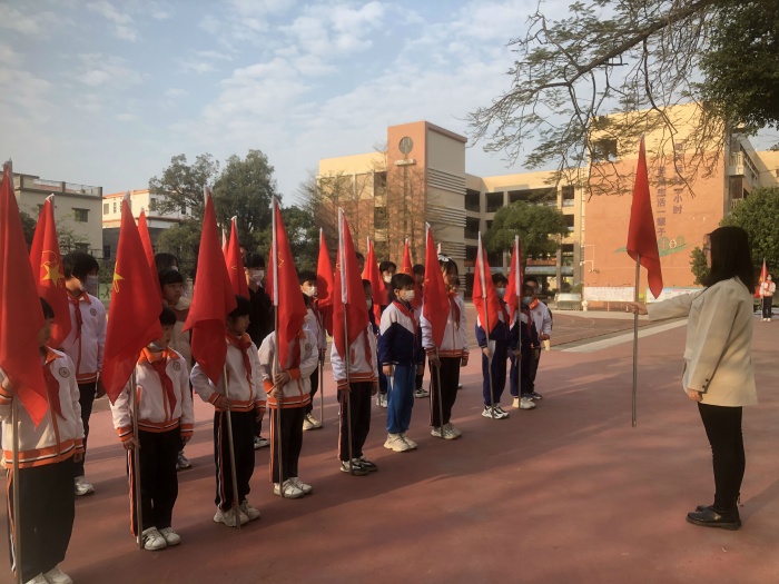 廖老師先向大家講解隊(duì)旗基礎(chǔ)知識(shí),隨后對(duì)執(zhí)旗進(jìn)行了耐心、細(xì)致的講解,對(duì)學(xué)生的靜止執(zhí)旗和行進(jìn)執(zhí)旗的姿勢(shì)進(jìn)行規(guī)范要求,要求做到手臂、站姿、腳步移動(dòng)一絲不茍,旗手執(zhí)旗敬禮到稍息立正都符合標(biāo)準(zhǔn)。通過反復(fù)訓(xùn)練和動(dòng)作糾正,旗手的步伐、敬隊(duì)禮的姿勢(shì)等得到相應(yīng)的提高,展現(xiàn)出良好的姿態(tài)、標(biāo)準(zhǔn)的動(dòng)作、嚴(yán)整的隊(duì)容。