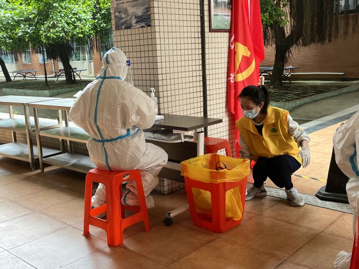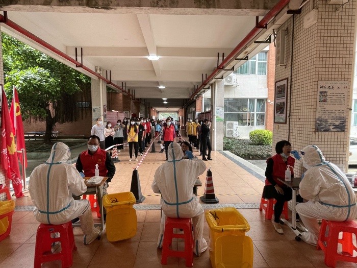 黨員干部全程帶頭奮戰(zhàn)在疫情一線,發(fā)揮黨員的先鋒模范作用,現(xiàn)場指揮秩序、幫助行動不便的同學(xué)完成核酸檢測。全體教職工協(xié)助維持現(xiàn)場秩序,協(xié)助醫(yī)護人員掃碼檢測,定人定崗,盡職盡責(zé)。全體師生職工積極配合醫(yī)護人員的檢測工作,整個過程有條不紊,秩序井然。僅用2個小時,完成了全校一千六百多名師生職工的核酸采樣工作。
