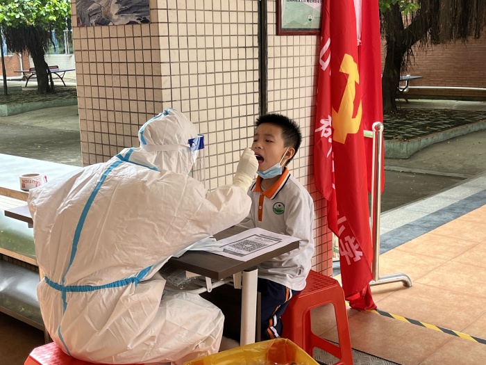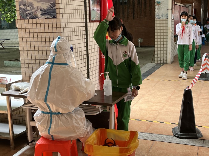 上午9點,醫(yī)護人員及全體教職工開始緊張有序地籌備各項檢測工作。為有效避免人員聚集,全校34個班級聽從學(xué)校的統(tǒng)一調(diào)度,采用廣播通知的方式,分班分批次,錯峰抵達檢測地點等候檢測。廣播通知到的班級由該節(jié)課的任課老師帶隊來到檢測點,分三列縱隊,自覺佩戴口罩,前后保持1米距離,采?。保叭艘唤M混采。檢測完畢后,按照順序有序地回到班級。