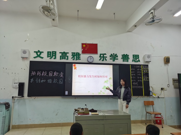 德育處主任陳結(jié)嫻利用午讀時(shí)間,向全體學(xué)生發(fā)出倡議:嚴(yán)格遵守校規(guī)校紀(jì),規(guī)范自己的言行,同學(xué)之間互相幫助、互相關(guān)愛(ài),做一名文明有禮的學(xué)生。同時(shí)要提高法治意識(shí),遠(yuǎn)離校園欺凌,加強(qiáng)自我保護(hù),共同打造安全校園、和諧校園。她希望每個(gè)同學(xué)都要提高防范校園暴力的意識(shí),減少校園欺凌的風(fēng)險(xiǎn)。既不要做“旁觀者”,也不要做“受害者”,更不要做“欺凌者”。