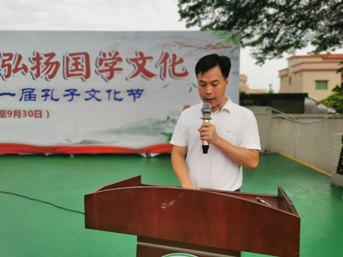 唱響國歌后,吳博事校長以風(fēng)趣生動(dòng)的開講方式與同學(xué)們追思孔子遺風(fēng)。他告誡全體師生要珍視先哲的傳統(tǒng),感悟先哲修身的智慧,在國學(xué)經(jīng)典里學(xué)做人、交友、為學(xué)之道。淳淳話語如春風(fēng)撫慰著師生的心靈。他希望同學(xué)們能真正靜下心來,學(xué)習(xí)古圣先賢,讀經(jīng)典、誦經(jīng)典、品經(jīng)典,做到文明修身處世,踐行中華優(yōu)秀傳統(tǒng)文化,弘揚(yáng)國學(xué)精神。