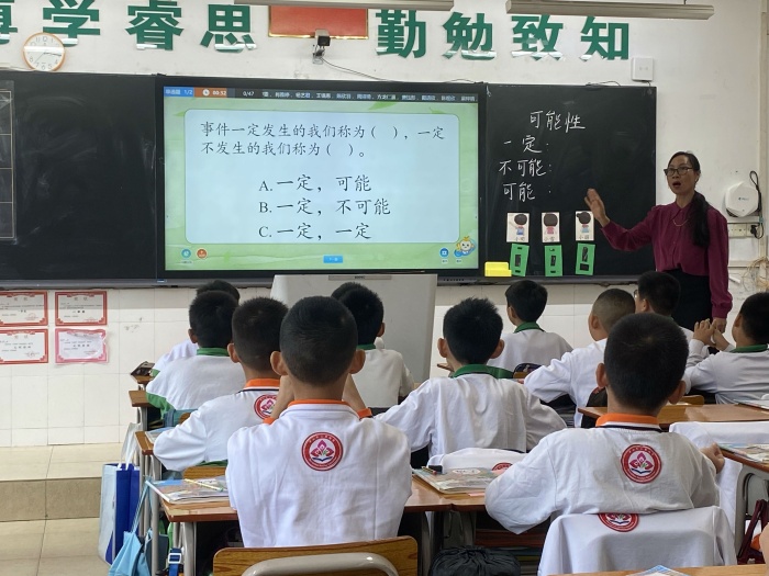 本次活動由課題組成員陳平芳副校長執(zhí)教數(shù)學(xué)課例《可能性》,這是人教版教材五年級上冊第44頁例1和第45頁“做一做”的教學(xué)內(nèi)容。陳副校長利用“愛種子”自主學(xué)習(xí)模塊,通過“生活現(xiàn)象——個別探究——協(xié)作建構(gòu)——練習(xí)檢測”四個課堂活動,精心展開教學(xué),讓學(xué)生在自主學(xué)習(xí)與小組合作中達(dá)到對新知識的融會貫通。最后的“達(dá)標(biāo)測評”環(huán)節(jié),既是教師對學(xué)生學(xué)習(xí)效果的課堂檢測,也是學(xué)生對自主學(xué)習(xí)效果的反饋。整個教學(xué)過程中,陳副校長充分引導(dǎo)學(xué)生積極參與課堂,體現(xiàn)學(xué)生的學(xué)習(xí)主體作用,使學(xué)生樂于探究,積極思考,會質(zhì)疑、交流、合作,主動獲取知識。同時,通過學(xué)生的答題反饋,老師及時掌握學(xué)生的學(xué)習(xí)情況,及時糾正知識中的錯誤。