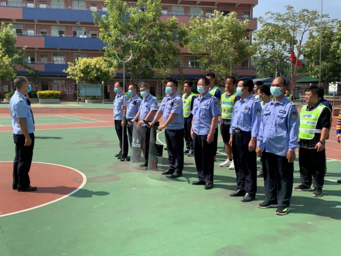 接著,鄭觀明警官和黃偉龍警官宣布大家進入“突發(fā)事件應(yīng)急處置”演練環(huán)節(jié)。情境設(shè)定:由一名便衣民警同志模擬充當危險分子的角色,手持兇器對護校隊員進行攻擊,試圖沖擊校園安保防線。護校隊當即進入突發(fā)情況應(yīng)急狀態(tài),保安和護校隊員們快速組成合作小組,一邊利用手中的鋼叉、盾牌和警棍等器械與危險分子周旋,同時啟動一鍵報警系統(tǒng),護校隊員們各就各位,迅速聯(lián)系肖家村派出所和西山村委治保會力量,協(xié)力將危險分子制服。