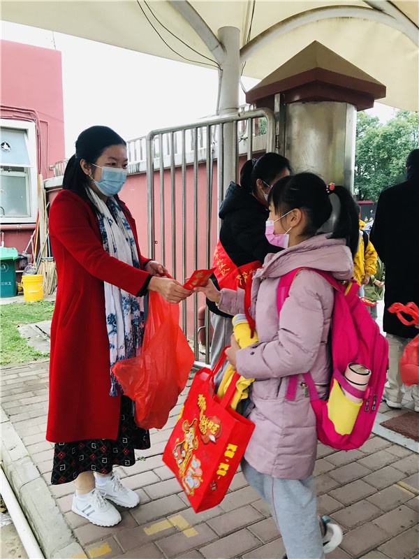 三鄉(xiāng)鎮(zhèn)白石環(huán)小學(xué),紅色外墻沐浴著晨曦,透著濃濃的新春氣息,一副長長的對(duì)聯(lián)高掛在教學(xué)樓前,廣場(chǎng)旁的草地上帶著虎娃的“新年好”赫然醒目,樹上吊著學(xué)生的各式手工燈籠。校門口,全體行政、值日教師和4位禮儀隊(duì)員滿面笑容分別在列隊(duì)正門與側(cè)門,給到校的每一位師生發(fā)新年禮物——利是封,利是封里裝著利是糖、棒棒糖和祝福書簽。千余名師生接過禮物,相互祝福著,邁著輕快的腳步進(jìn)入校園,走進(jìn)具有同樣春意的教室,教室的黑板上寫好了歡迎詞,掛上了學(xué)生相關(guān)“春”的作品。
