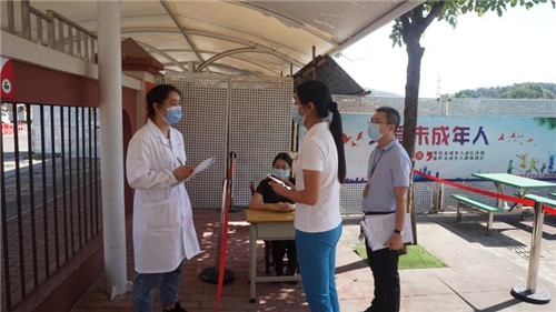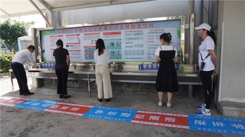 下午3時,全體教職工戴著口罩,在校門口依次排開,演練開始。門衛(wèi)、值日行政謝萬明、值日教師徐稱阜、校醫(yī)對入校“學(xué)生”體溫測量,測量體溫合格后,“學(xué)生”前后相間一米成一路縱隊,安靜有序地步行到教學(xué)樓前的洗手池,洗手后進(jìn)入教室。發(fā)現(xiàn)體溫異常并伴有咳嗽癥狀“學(xué)生”,校醫(yī)立即將其轉(zhuǎn)移至校門口的臨時隔離區(qū),做好心理安撫。按照應(yīng)急預(yù)案流程,用水銀溫度計復(fù)核體溫,做好流行病史等記錄,馬上上報校長......
