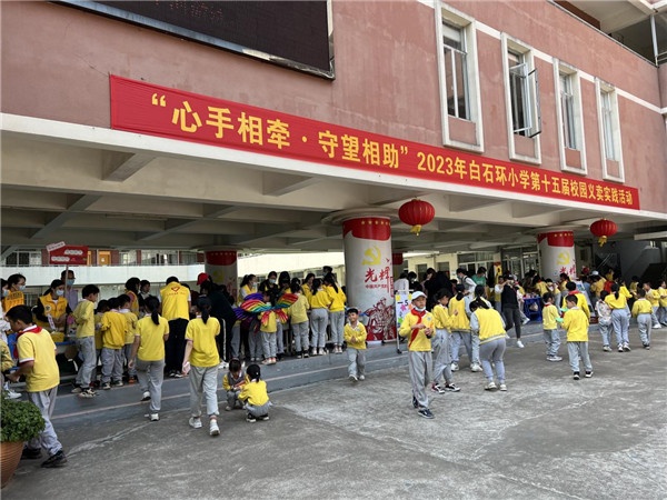 “東風(fēng)好作陽和使,逢草逢花報發(fā)生”,三月天,和風(fēng)艷陽,疫散花開,在這欣欣向榮的學(xué)雷鋒月,為踐行社會主義核心價值觀,進(jìn)一步培養(yǎng)學(xué)生以實際行動誠信做人、愛心助人的品質(zhì),樹立團(tuán)結(jié)合作、勤儉節(jié)約的意識,激發(fā)孩子參與公益活動的熱情,3月10日下午,三鄉(xiāng)鎮(zhèn)白石環(huán)小學(xué)舉行了以“心手相牽 守望相助”為主題的第十五屆校園義賣實踐活動。義賣所得款項將用來作為捐助對口幫扶學(xué)校——潮州市饒平縣上饒鎮(zhèn)中心小學(xué)購買圖書、文具、體育用品等。