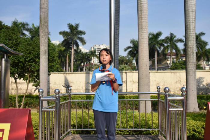 出旗完畢,主持人充滿力量與激情的話語,點燃著每一位先鋒隊員的熾熱內(nèi)心,她滿懷激情地說“我們的隊旗高高飄揚(yáng),星星火炬閃耀著金光,我們的隊歌鏗鏘而嘹亮,召喚著伙伴響徹四方!”接著,少先隊員們內(nèi)心激動,以最嘹亮的聲音共同奏唱中國少年先鋒隊隊歌,他(她)們在歌聲中唱出熱情、理想和信念。