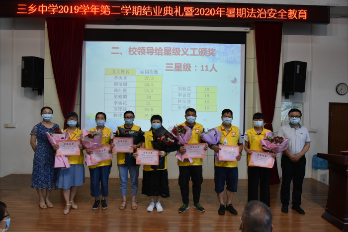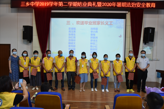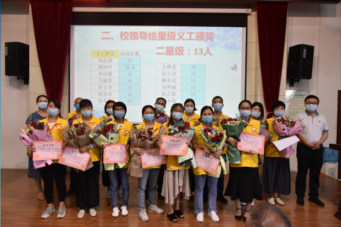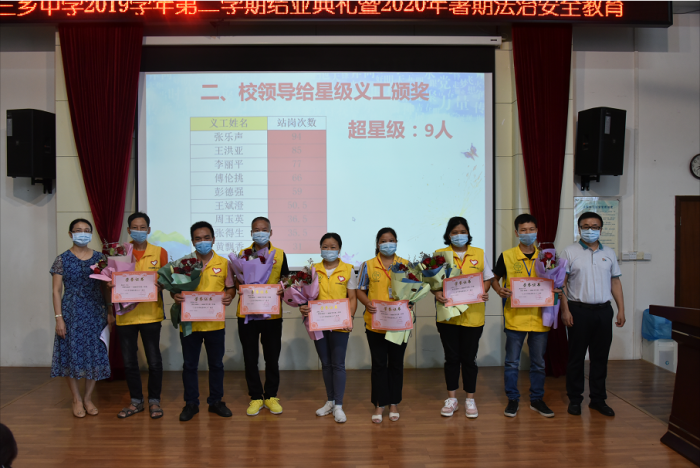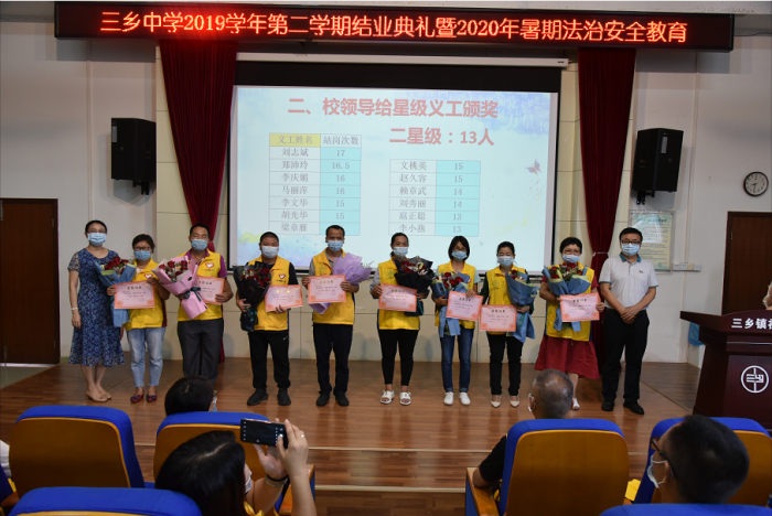 三鄉(xiāng)中學(xué)的家長(zhǎng)義工隊(duì)伍是家校合作的典范,家長(zhǎng)義工們?cè)趯W(xué)校門(mén)口交通秩序的維護(hù)以及學(xué)校大型活動(dòng)的志愿服務(wù)方面做出了重大貢獻(xiàn)。本學(xué)期評(píng)選了9位“超星級(jí)義工”、11位“三星級(jí)義工”,13位“二星級(jí)義工”19位“一星級(jí)義工”。家長(zhǎng)義工們真正踐行了“奉獻(xiàn)、友愛(ài)、互助、進(jìn)步”的志愿服務(wù)精神,義工的表彰環(huán)節(jié)對(duì)于三中全體學(xué)子而言無(wú)疑也是一次很好的教育契機(jī)和精神洗禮。家長(zhǎng)義工隊(duì)伍聚是一團(tuán)火,散是滿天星,學(xué)校也表達(dá)了對(duì)畢業(yè)班家長(zhǎng)義工的美好祝福和誠(chéng)摯感謝。