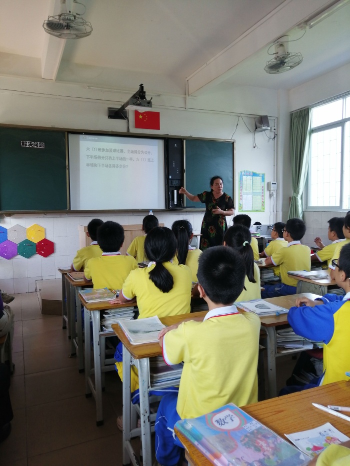 接著由吳桂珍老師給東華學(xué)校六(6)班的同學(xué)帶來了一節(jié)《解決問題》,吳老師首先帶著同學(xué)們復(fù)習(xí)了解決問題的一般過程,突出分數(shù)解決問題的關(guān)鍵——把握單位“1”。再引導(dǎo)學(xué)生根據(jù)題目條件畫線段圖,列關(guān)系式,再列方程解答。并在學(xué)生思考交流的基礎(chǔ)上,從不同角度用多種方法解決問題,發(fā)展了學(xué)生的幾何直觀和創(chuàng)新意識。吳老師豐富的教學(xué)經(jīng)驗給聽課老師留下了深刻的印象。