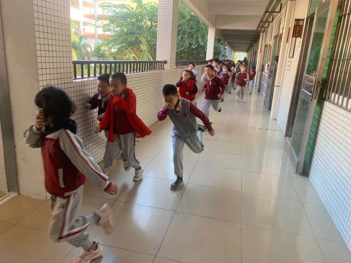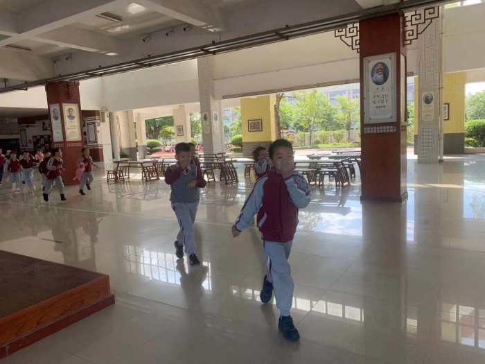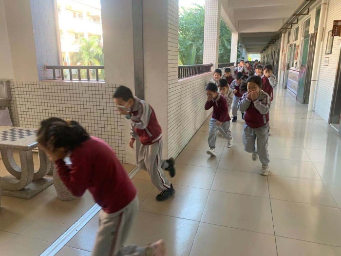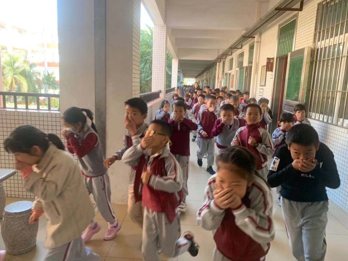 上午9:52分,當學校廣播室發(fā)出的防空警報信號后,正在上課的全校學生,在任課老師的組織引導下,迅速撤離教室,按指定路線有序疏散逃生。頓時,學校各樓層走廊上、各樓梯上人頭攢動,各班都是分為兩列縱隊,手捂住口鼻,快速、有序地向操場撤離。