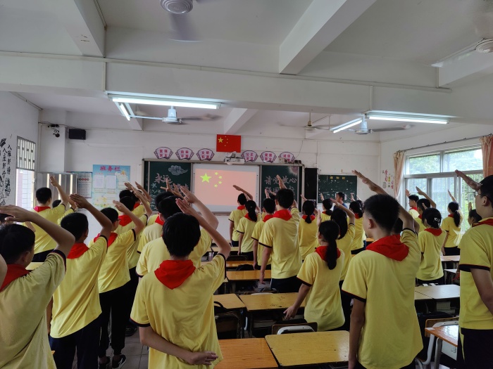 華強學校少工委主任、校長劉鍵給隊員們上了一堂生動的黨課,他告訴同學們:“作為新時代的青少年,一定要樹立共產主義遠大理想,堅定信仰信念,永遠感黨恩、聽黨話、跟黨走,扣好人生的第一粒扣子,積極踐行社會主義核心價值觀,繼承革命優(yōu)良傳統(tǒng),弘揚中華民族偉大精神。不斷在德、智、體、美、勞等方面發(fā)展自己、提升自己,以蓬勃的朝氣披荊斬棘、乘風破浪,以昂揚的姿態(tài)開拓進取、奮力前行。努力為黨、為祖國、為人民作貢獻,為自己的青春涂上中國夢的絢麗色彩。學校少工委主任劉鍵校長還利用紅領巾廣播時間,對全校少先隊員及師生作了主題為“請黨放心,強國有我”的開學第一節(jié)思政課。全體師生和少先隊員們承諾一定會努力工作、好好學習、請黨放心、強國有我!