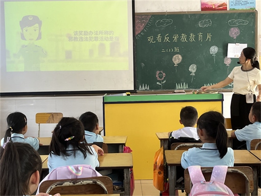 以宣傳為導向,提高反邪教意識??禈沸W組織了國旗下講話《珍愛生命,拒絕邪教》,給全校師生上了一堂生動的反邪教教育課?!爸v話”從什么是邪教入手,告誡大家:必須徹底摒棄封建迷信。同時提醒廣大青少年,在科技發(fā)達的今天,雖然舊的封建迷信思想已被扔進了歷史的垃圾箱,但新的迷信形式又出現(xiàn)了——那就是各種邪教;充分利用學校宣傳陣地,如LED電子屏、班級微信群等,發(fā)布反邪教宣傳標語、短視頻,加強對師生及家長的警示宣傳教育。