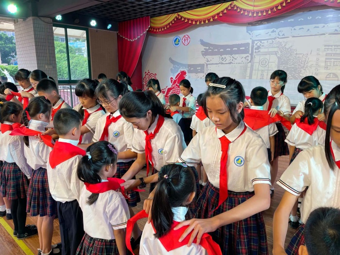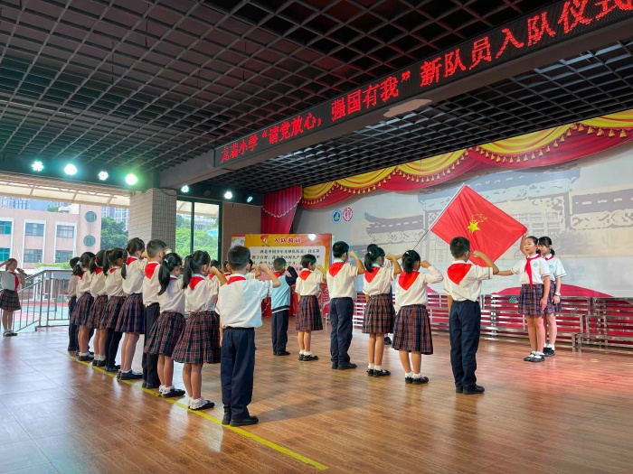 當大隊輔導員黃笙宥老師宣讀新隊員名單后,六年級的哥哥姐姐作為代表為二年級新入隊的弟弟妹妹有序佩戴上了鮮艷的紅領巾,并互敬隊禮,見證了新隊員們成長中的重要時刻。飄揚在胸前的紅領巾,不僅是“少先隊員”身份的光榮象征,更是引領著新隊員不斷前行的火炬。接著,在大隊長鄭佩怡的帶領下,全體隊員在隊旗下,驕傲地挺起胸膛、握緊拳頭莊嚴宣誓:“我是中國少年先鋒隊隊員,我在隊旗下宣誓:我熱愛中國共產(chǎn)黨,熱愛祖國,熱愛人民,好好學習,好好鍛煉,準備著,為共產(chǎn)主義事業(yè)貢獻力量!”鏗鏘有力的宣誓聲,表達了隊員們向上的決心與意志。