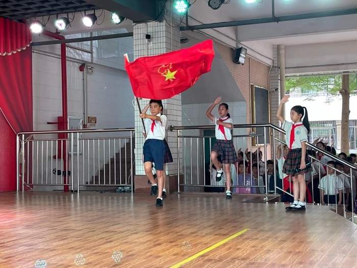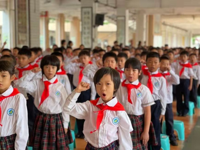 伴隨著熟悉的出旗曲,是莊嚴的出旗儀式,大隊旗手與護旗手邁著整齊的步伐,精神抖擻地走向前來,2021年新隊員入隊儀式由此拉開序幕?!拔覀兪枪伯a(chǎn)主義接班人,繼承革命先輩的光榮傳統(tǒng)……”聽,龍小鯉們個個精神飽滿,高唱隊歌,這清脆的童聲表達著孩子們即將成為少先隊員的自豪和喜悅!