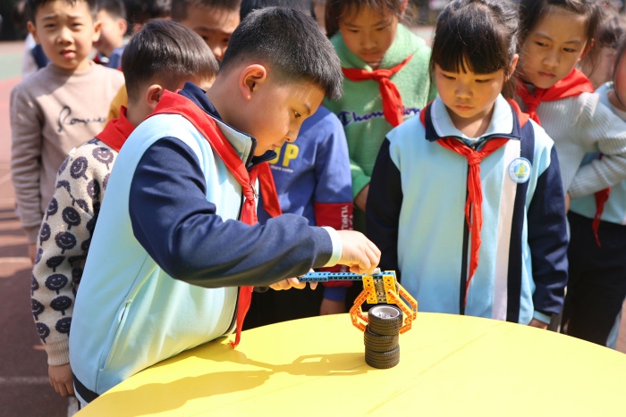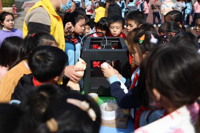 在開(kāi)幕式上,彭先明主任為活動(dòng)致開(kāi)幕詞,鼓勵(lì)同學(xué)們從小學(xué)好文化知識(shí),培養(yǎng)學(xué)科學(xué)、想科學(xué)、用科學(xué)的習(xí)慣。隨后,高玉璇校長(zhǎng)宣布科技節(jié)開(kāi)幕。本次科技節(jié)活動(dòng)內(nèi)容豐富、形式多樣,有干冰大炮實(shí)驗(yàn)、大疆機(jī)甲戰(zhàn)車體驗(yàn)、機(jī)械手臂壘高高、剪刀石頭布機(jī)器人、飛機(jī)大戰(zhàn)、避障機(jī)器人、射擊比賽等體驗(yàn)項(xiàng)目,還有科技創(chuàng)新大賽獲獎(jiǎng)作品和3D打印技術(shù)展示。每個(gè)活動(dòng)都有志愿者老師現(xiàn)場(chǎng)講解以及指導(dǎo),同學(xué)們可以根據(jù)自己的興趣愛(ài)好加入體驗(yàn)行列。多功能廳還有一場(chǎng)“飛機(jī)是如何起飛的?”專題講座,三、四年級(jí)的同學(xué)分批參加了活動(dòng),現(xiàn)場(chǎng)氣氛熱烈,師生互動(dòng)問(wèn)答,學(xué)生在科學(xué)的海洋中盡情遨游。