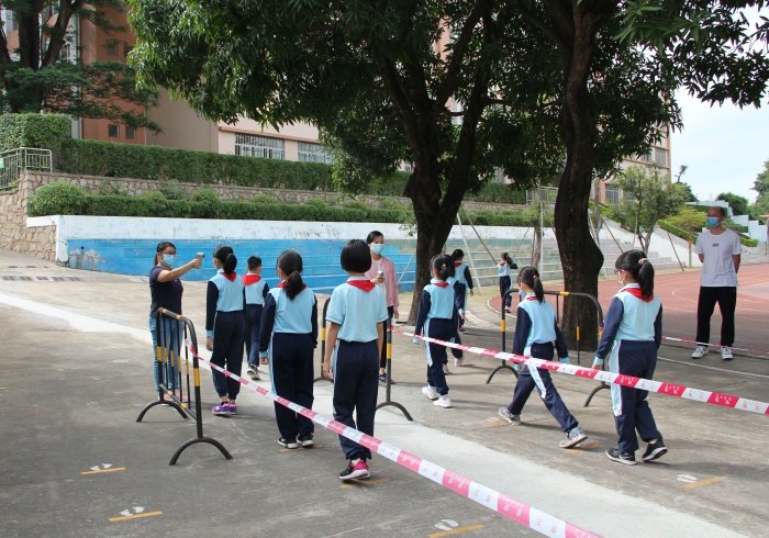 學(xué)生晨檢是在學(xué)校防疫工作中一個(gè)最常態(tài)的場(chǎng)景,學(xué)生在保安和值日教師的指揮引導(dǎo)下,按地面標(biāo)識(shí)相互間隔一米,佩戴口罩,有序測(cè)溫,如遇可疑病例學(xué)生,值日教師引導(dǎo)該學(xué)生由學(xué)校保健老師進(jìn)一步復(fù)測(cè),然后向值日組長(zhǎng)匯報(bào)情況以及通知班主任,班主任模擬聯(lián)系家長(zhǎng)并到現(xiàn)場(chǎng)、模擬非可疑病例,家長(zhǎng)帶學(xué)生到正規(guī)醫(yī)院就診,最后衛(wèi)生專干楊老師對(duì)臨時(shí)觀察點(diǎn)進(jìn)行全面的消毒。在演練中,班主任一一跟進(jìn),熟悉應(yīng)急流程,了解跟蹤處理工作。