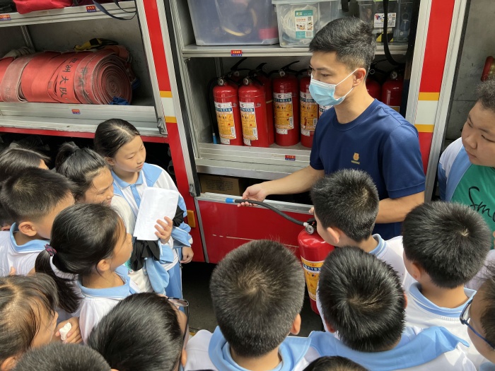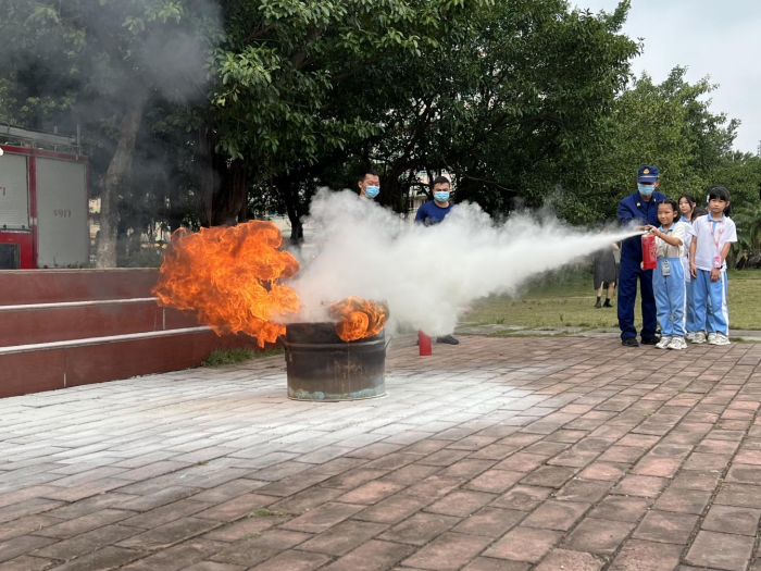 接著,神灣專職消防隊(duì)隊(duì)員現(xiàn)場(chǎng)講解并演示了滅火器的正確操作方法后,學(xué)校義務(wù)消防隊(duì)成員和學(xué)生代表大膽嘗試,親身體驗(yàn)用滅火器撲滅火種,滿滿的成就感溢于言表。