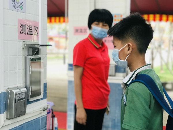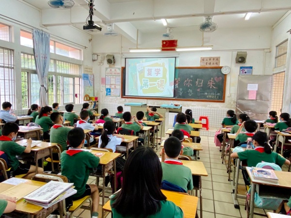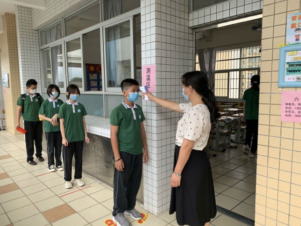 溫情的迎接禮后,各班班主任、副班主任早已面戴口罩、手拿測溫槍,在課室門口等待已久。必要的入班檢查后,學生們端正坐在熟悉的課室里,迎來了這場與以往有所不同的開學典禮。耳邊響起熟悉的國歌,隊員們整齊的敬禮,同學們在視頻里接受了譚瑞香校長的開學祝福,在班主任的組織下觀看了復學第一課視頻、學習了一日生活指南等,神采奕奕又充滿專注的雙眼里,寫滿了對課堂、對學習的渴望。