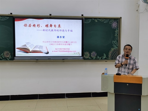 潘志堅為全體教師作《你若精彩,蝶舞自來——新時代教師的師德與幸?!穼n}講座。潘志堅從“活在當下:教師的現(xiàn)實寫照”、“且行且思:教師的理想定位”、“立德修身:教師的職業(yè)操守”、“幸福踐行:教師的自覺追求”四個方面侃侃而談,對新時代教師的師德與幸福進行了深入解讀。他以一組“年輕教師忙碌的一天”漫畫呈現(xiàn)當前中小學教師的現(xiàn)實寫照,啟發(fā)老師們思考:我們每天從事的教育教學工作的本質(zhì)是什么?什么是教育?教師做什么?希望教師們學會微笑、學會表達、學會親近、學會傾聽、學會溝通、學會感受、學會發(fā)現(xiàn),努力修煉教師的人格魅力,做一個具有堅定的政治方向、高尚的個人品德、穩(wěn)定的心理品質(zhì)、良好的行為習慣、向上的社交能力、高雅的審美情趣的魅力型教師?!敖陶哂袎?,師者有理”,潘志堅認為,教師首先是幸福生活的熱烈追求者,有理想信念的教師是幸福的教師。他帶領(lǐng)老師們一起重溫“習近平總書記對新時代教師的定位”和“新時代中小學教師職業(yè)行為十項準則”,鼓勵老師們用實際行動詮釋著師德師風的真正內(nèi)涵,做心中有愛的筑夢人,做學生健康成長的價值引領(lǐng)者和心靈關(guān)懷者,以良好的師德共同撐起教育的藍天。