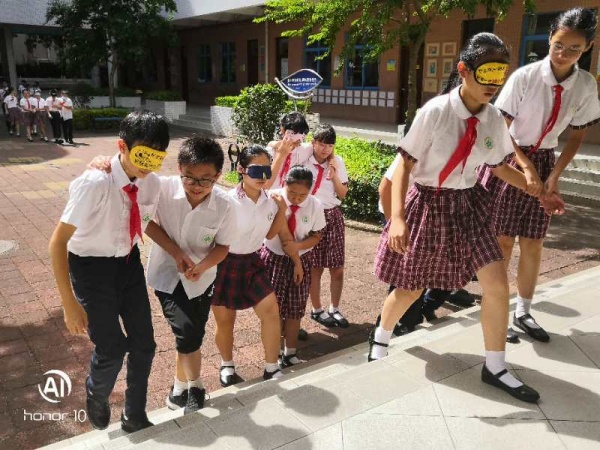 典禮伊始,陳曉婷老師組織全體同學(xué)開展了一個團康小活動——人生旅途。開展此次活動的目的是讓孩子們通過活動感受每個人的生命都是不完美的,需要相互幫助,共同戰(zhàn)勝困難。陳老師講解完活動規(guī)則后,各班同學(xué)2人一組,一人體驗啞巴角色,一人體驗盲人角色,一組跟著一組有序地從教室安全抵達學(xué)校大堂指定位置。在行進過程中,同學(xué)們始終保持隊列秩序,聽從指揮,遵守紀(jì)律,保持安靜,展現(xiàn)了石岐一小學(xué)子良好的精神風(fēng)貌。