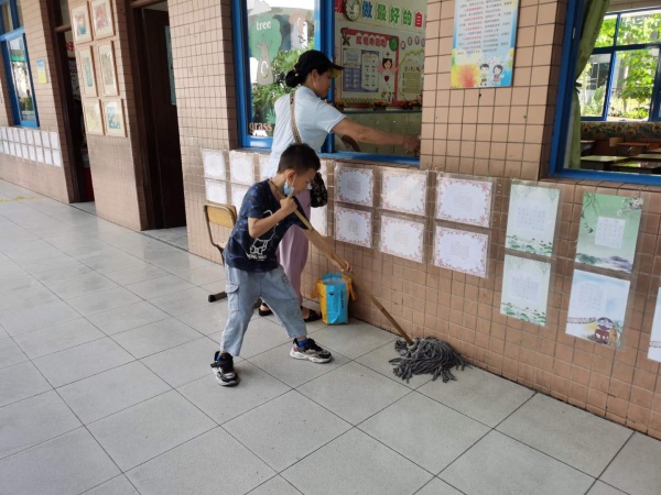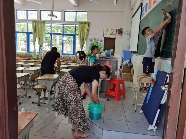 7月12日上午,第三批志愿者——部分親子義工隊成員回到學校進行教室清掃大會戰(zhàn)。