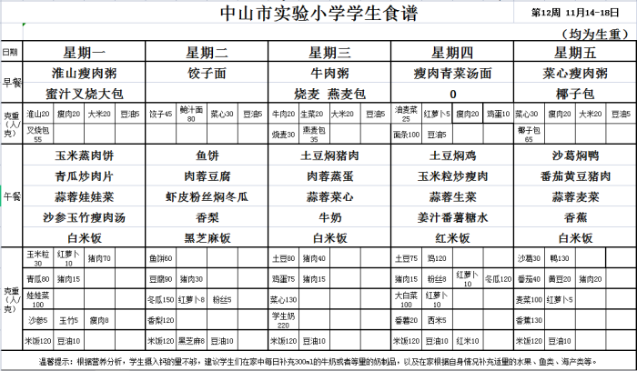 中山市實驗小學(xué)第12周學(xué)生食譜