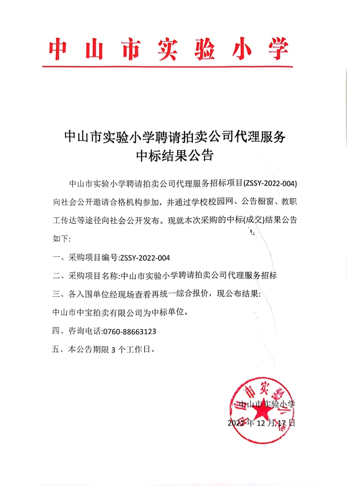 中山市實(shí)驗(yàn)小學(xué)聘請(qǐng)拍賣(mài)公司代理服務(wù)中標(biāo)結(jié)果公告