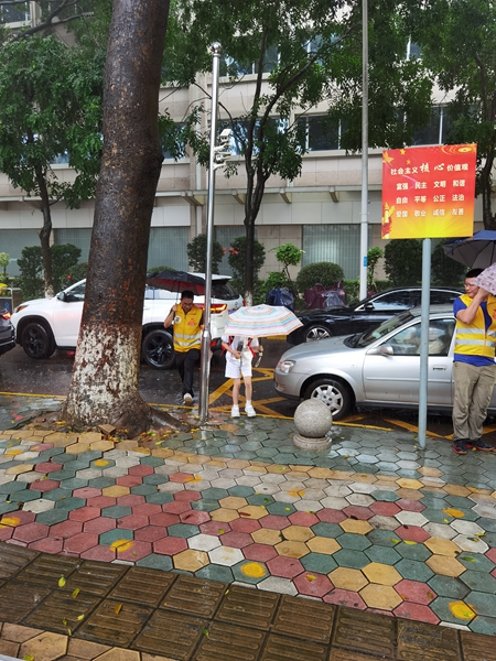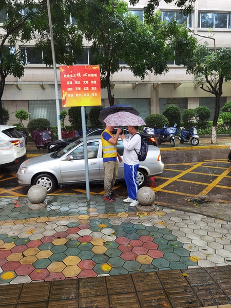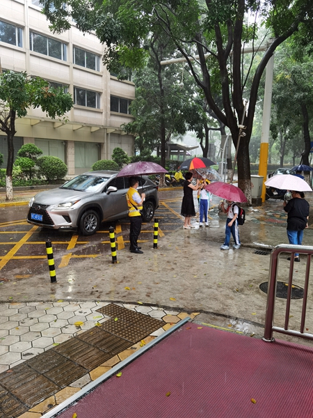 6月8日早晨,中山市氣象臺(tái)發(fā)布暴雨橙色預(yù)警。大大的雨點(diǎn)砸下來,發(fā)出噼里啪啦的響聲,似乎有意考驗(yàn)上學(xué)的學(xué)子。今天剛好輪到五(3)班值崗,6位家長無懼風(fēng)雨,撐著雨傘,身穿黃馬甲,始終堅(jiān)守在崗位上,有序地指揮學(xué)生過路,指揮家長停車,迎接學(xué)生們安全順利地進(jìn)入校園。