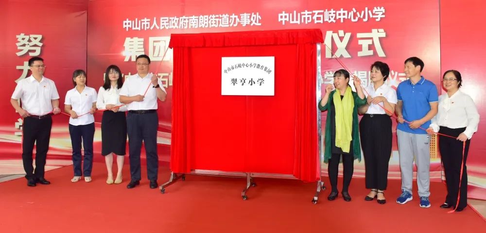 與會(huì)領(lǐng)導(dǎo)、嘉賓共同為“中山市石岐中心小學(xué)教育集團(tuán)翠亨小學(xué)”揭牌,接著合照留念。