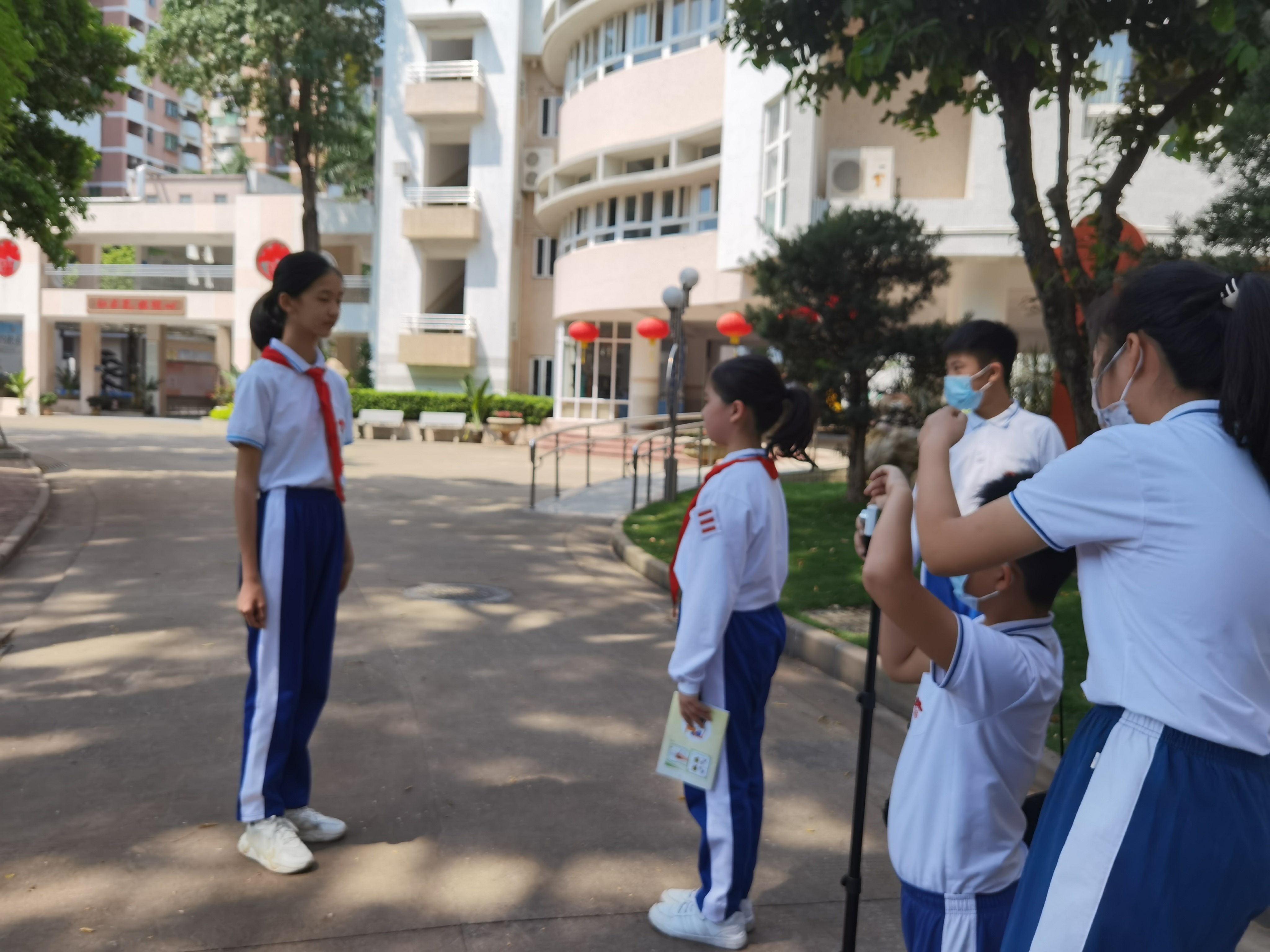 接到任務(wù)后,隊員們分工合作。兩位總隊委負責寫腳本,制作課件,擔任講解員。兩位紅棉影視社團隊員負責內(nèi)外景拍攝和剪輯視頻。孫浩誠同學負責內(nèi)外溝通協(xié)調(diào)。他們用了兩周的時間,終于順利完成了拍攝工作。視頻在隊會課上向全校師生播放,讓大家進一步了解了爭章過程,明晰了爭章方法,對學?!凹t領(lǐng)巾獎?wù)隆睜幷禄顒拥闹鸩酵七M起到了很好的作用。