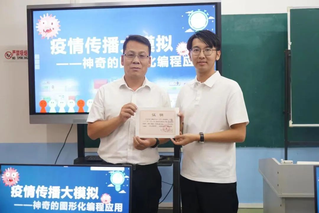 中山市教育教學研究室信息技術(shù)教研員陳明宏老師和省級教研基地負責人杏建紅主任分別給兩位老師頒發(fā)了送教證明。
