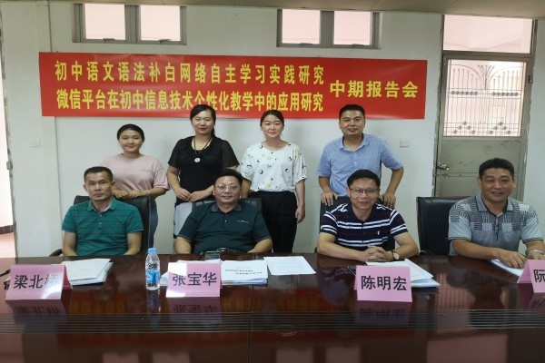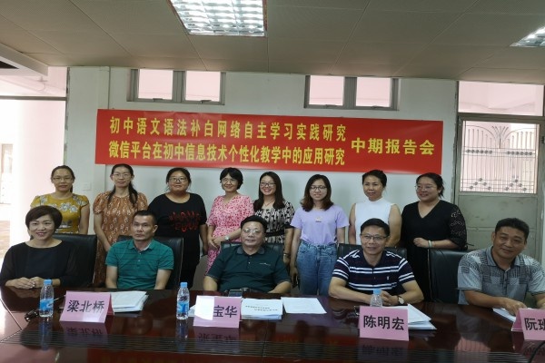 2020年7月10日,中山市《初中語文語法補(bǔ)白網(wǎng)絡(luò)自主學(xué)習(xí)實踐研究》、《微信平臺在初中信息技術(shù)個性化教學(xué)中的應(yīng)用研究》課題中期報告會在坦洲實驗中學(xué)行政樓會議室舉行。市教研室張寶華老師、陳明宏老師,坦洲鎮(zhèn)教育事務(wù)指導(dǎo)中心梁北橋老師,坦洲實驗中學(xué)梁格青校長、高艷玲副校長、阮班俊主任出席報告會,課題組全體成員列席本次會議。