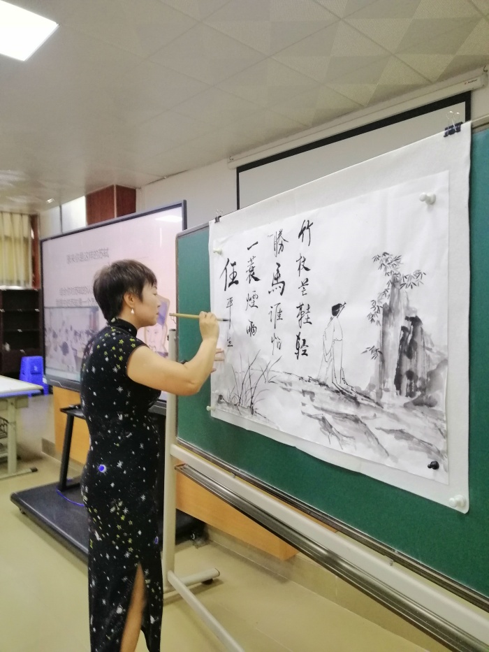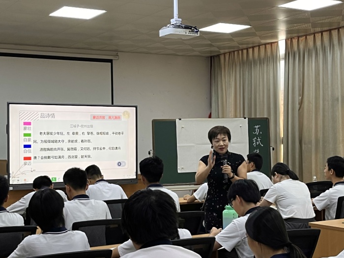 在主持人孫江林老師生動(dòng)的開場(chǎng)后,葛艷秋、張綺文、全亞玲老師為大家?guī)?lái)一場(chǎng)別開生面的雙師雙融創(chuàng)新課堂。課堂的前半部分,葛艷秋老師帶領(lǐng)學(xué)生們徜徉于詩(shī)詞的詩(shī)情畫意中,在朗誦中體會(huì)蘇軾豪邁的氣勢(shì),在品讀中領(lǐng)略曠達(dá)的人生。全亞玲老師現(xiàn)場(chǎng)作畫,營(yíng)造氛圍。和諧生動(dòng)的朗誦、清淡絕妙的水墨丹青帶領(lǐng)現(xiàn)場(chǎng)師生在中國(guó)傳統(tǒng)文化中暢游遐想。隨后張綺文老師緩步上前,接力課堂,在朗誦聲中引領(lǐng)學(xué)生與蘇軾進(jìn)行一場(chǎng)時(shí)空對(duì)話。在三位老師的合作下,一節(jié)有詩(shī)情畫意,有文化底蘊(yùn),有新穎形式的雙師雙融課堂應(yīng)運(yùn)而生。