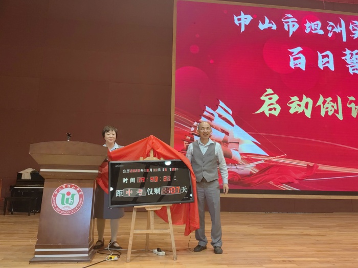 在初三師生的見證下,坦洲實驗中學(xué)黨總支書記朱漢業(yè)為2023屆中考倒計時牌揭幕,吹響了中考沖鋒的號角!朱書記鼓舞同學(xué)們:“在這最關(guān)鍵的100天里,必須明確目標(biāo),增強信心,虛心求教,刻苦學(xué)習(xí),科學(xué)安排時間,堅持不懈地努力下去,用智慧贏得勝利,共同書寫自己的人生新篇章,讓自己的青春不留遺憾。”