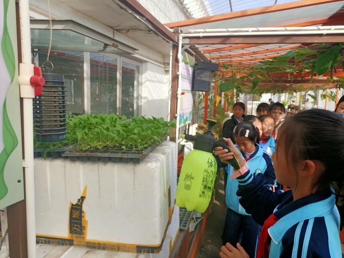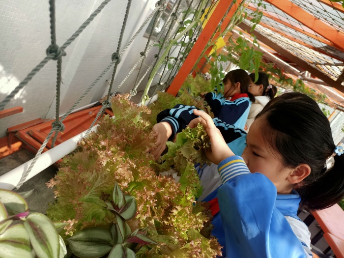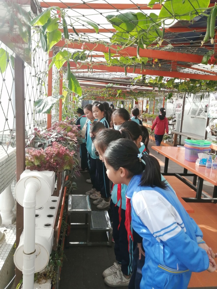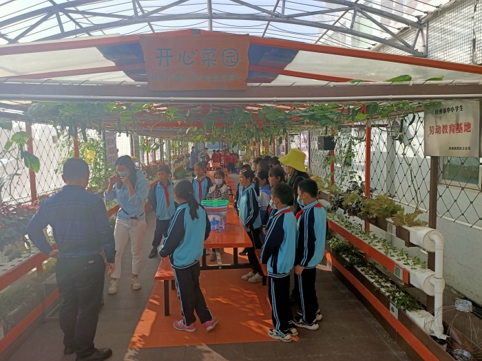活動(dòng)包括兩部分。首先,安阜小學(xué)師生一行來(lái)到林東小學(xué)樓頂?shù)乃嗍卟藙趧?dòng)基地參觀實(shí)踐。林東小學(xué)勞動(dòng)實(shí)踐基地的講解員為大家詳細(xì)介紹了水培蔬菜的種植方法,通過(guò)營(yíng)養(yǎng)液為其提供水分、養(yǎng)分、氧氣,有別于傳統(tǒng)土壤栽培形式下進(jìn)行的新型栽培方式。講解員還讓他們親自觀察自己平時(shí)吃的蔬菜是如何在水里生長(zhǎng)的,并耐心解說(shuō)水培蔬菜的特點(diǎn)和優(yōu)勢(shì),這讓一部分平時(shí)不太接觸農(nóng)作物的學(xué)生增長(zhǎng)了不少農(nóng)耕知識(shí),也刷新了他們對(duì)蔬菜種植的認(rèn)識(shí)。隨后,同學(xué)們?cè)谥v解員的指導(dǎo)下體驗(yàn)用剪刀親自采摘水培蔬菜,感受收獲的喜悅。