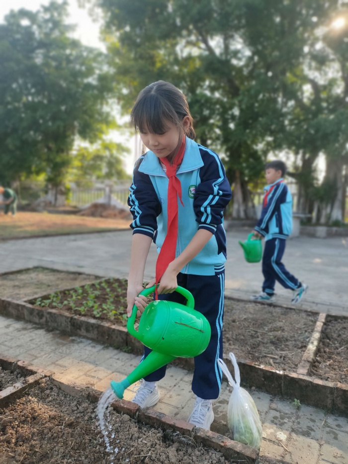 接下來(lái),一行人又隨著講解員來(lái)到土培蔬菜區(qū)。學(xué)生們?cè)诶蠋煹闹笇?dǎo)下分組井然有序地來(lái)到田間地頭,研究自己感興趣的蔬菜,并拿起水壺到水渠打水給地里的蔬菜澆水,最后分享各自的收獲。