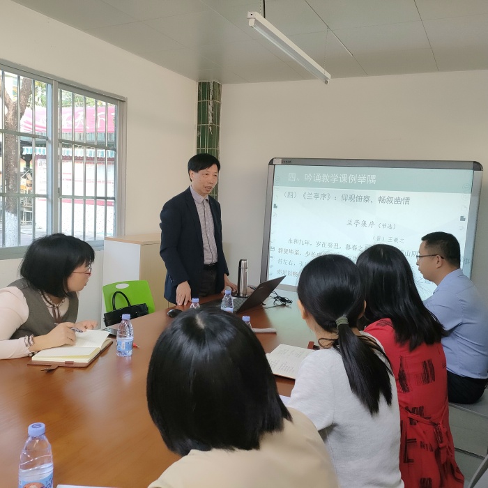 培訓活動在學校教工之家舉行。首先,余壁峰校長向全體語文老師介紹了嘉賓,宣布活動開始。接著,陳春艷主任就以“吟誦教學的意義及實施路徑”為主題,從“吟誦與吟誦教學” “吟誦及吟誦教學的意義” “吟誦教學的實施路徑”及 “吟誦教學課列舉隅”等方面對吟誦教學進行了精彩詳細的闡釋。活動中,陳主任現(xiàn)場度曲:吟誦了千古不變的吟唱《歲暮到家》,現(xiàn)場模擬情景教學吟誦《江南》,即興吟唱京劇味十足的《蘭亭序》等經(jīng)典詩詞,聲情并茂的吟誦讓在座老師們體驗了一堂耳目一新的吟誦課,也讓大家對吟誦有了更深入的認識。
