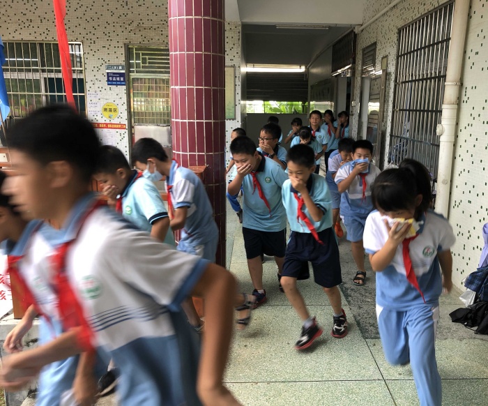 30日下午3點49分,隨著警報聲響起,各班班主任和科任教師及時準確地組織學(xué)生,迅速進入緊急疏散狀態(tài)。在老師的帶領(lǐng)下,全體學(xué)生彎著腰、貓著步,用手帕、毛巾等捂住口鼻,沿著學(xué)校指定樓梯口快速前進。近600多名師生訓(xùn)練有素地從各個室場撤離到學(xué)校小操場空地,僅耗時1分20秒。隨后各班班主任清點人數(shù),匯報給學(xué)校安全主任。能如此快速有序地撤離,得益于安阜小學(xué)平時對安全工作的重視,師生們在疏散時牢記注意事項與撤離路線。
