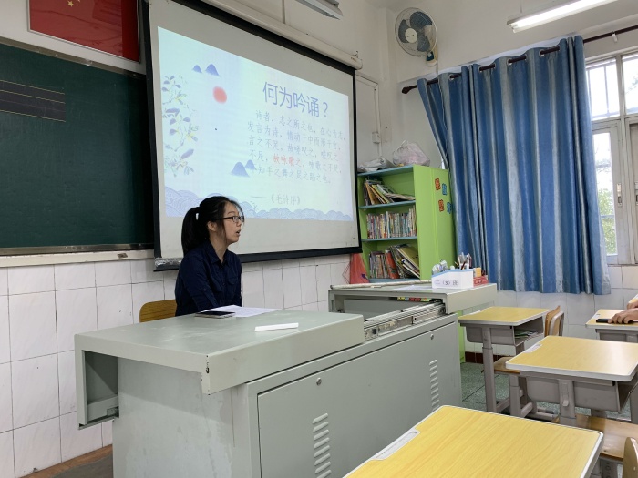 本次活動首先由余美卿老師介紹古詩文吟誦方法,為教師們能自主吟誦古詩文奠定基礎(chǔ)。余老師從依字行腔、依義行調(diào)的中國式作曲方法入手,先通過具有趣味性的日常語言吟誦示范解釋音調(diào)高低在詞句意義表達(dá)上的不同,介紹了古漢語“平長仄短、平高仄低、入短韻長”的特點在吟誦中的體現(xiàn)。接著,余老師示范吟誦了《出塞》、《桃夭》,通過這兩首表達(dá)不同情感的作品進(jìn)一步解釋“依義行調(diào)”的吟誦方法。古詩文吟誦魅力無窮,教師們也深深投入其中,積極嘗試吟誦。