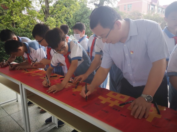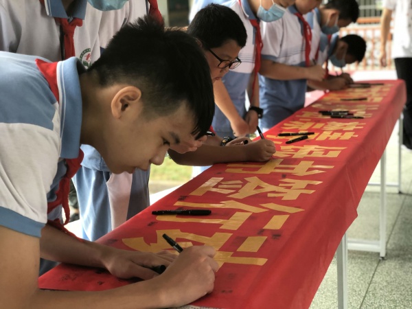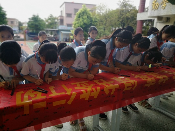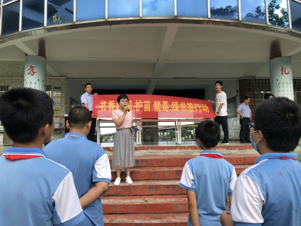 本次活動在莊嚴的升旗儀式下拉開序幕,學校德育主任傅嘉賢就活動精神展開講話,教育全體師生掃黃打非從自身做起,組織學生開展了一次護苗綠書簽簽名承諾活動。在學校德育處的組織下,學校余壁峰校長帶頭簽名,各班同學分年級進行,鄭重地在“書香校園.護苗.禁毒.綠書簽行動”橫幅上簽上自己的名字。當看到懸掛在學校門口有自己簽名的橫幅時,學生們紛紛表態(tài):“我要自覺抵制不良的網(wǎng)絡(luò)信息,做到健康上網(wǎng),同時要多讀正版書籍,為營造書香校園而努力!”