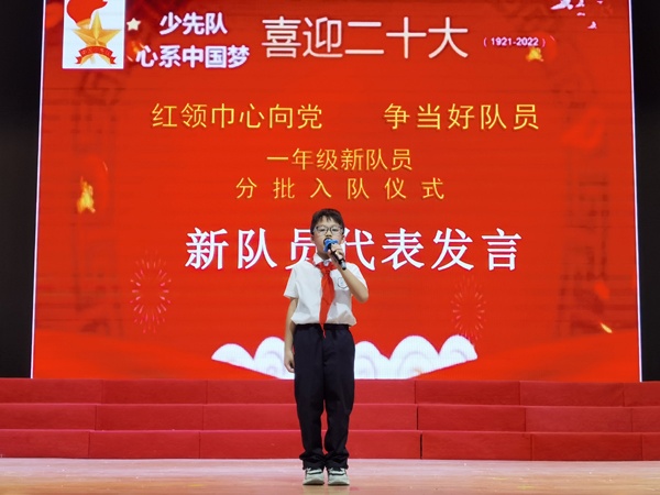 接著,優(yōu)秀少先隊(duì)員代表馬鈺同學(xué)結(jié)合自身入隊(duì)后的所思所想,引導(dǎo)新隊(duì)員們向隊(duì)組織靠攏,鼓勵(lì)他們積極進(jìn)取。新隊(duì)員代表盧栩諾同學(xué)在講話中告訴新隊(duì)員們應(yīng)立志在家、在校爭(zhēng)做先鋒。