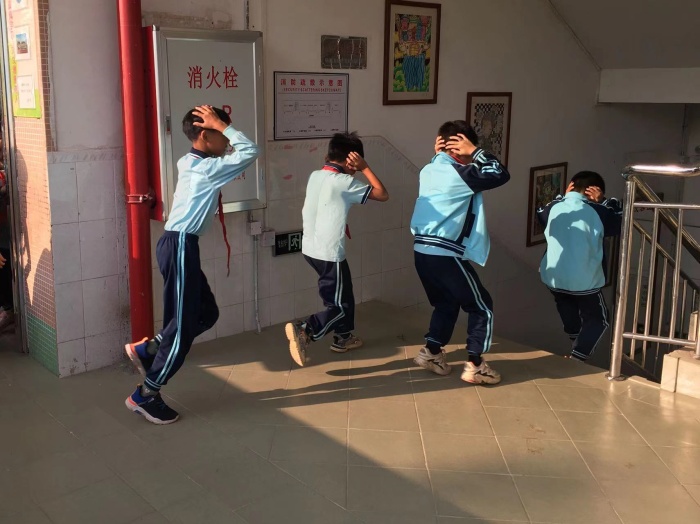 隨著校園內(nèi)響起的警報(bào)聲,上課老師指揮本班學(xué)生按原指定路線有序地撤離教室,全體學(xué)生抱頭彎腰有序撤出教學(xué)樓疏散到教學(xué)樓前指定位置,整個(gè)過程老師靈活處理突發(fā)問題,整個(gè)應(yīng)急演練活動(dòng)規(guī)范、有序、緊湊、高效,按照疏散演練方案設(shè)定的逃生路線,迅速而有序地到達(dá)指定安全位置。